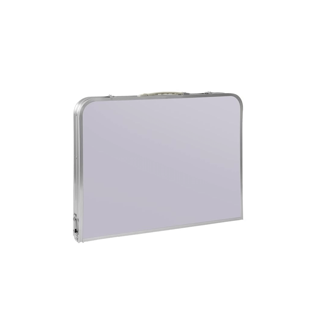 The table folds in the middle and transforms into a handy suitcase with a carry handle for easy transport.