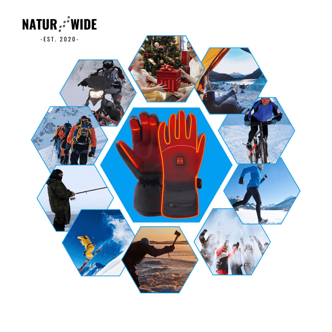 The NaturWide Heated Gloves deliver dependable warmth and protection on the coldest winter days. Included are two USB power banks (6,000 mAh each, one per glove) for up to 10 hours of heat—ideal for skiing, snowboarding, motorcycling, hiking, and everyday cold-weather use.