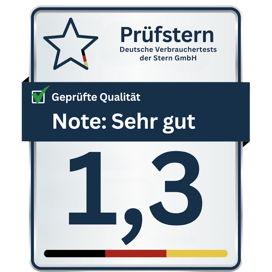 Our products were tested by the independent Prüfstern GmbH and awarded an overall rating of "Very Good (1.3)." This result confirms the high quality, durability, and reliability of our products.