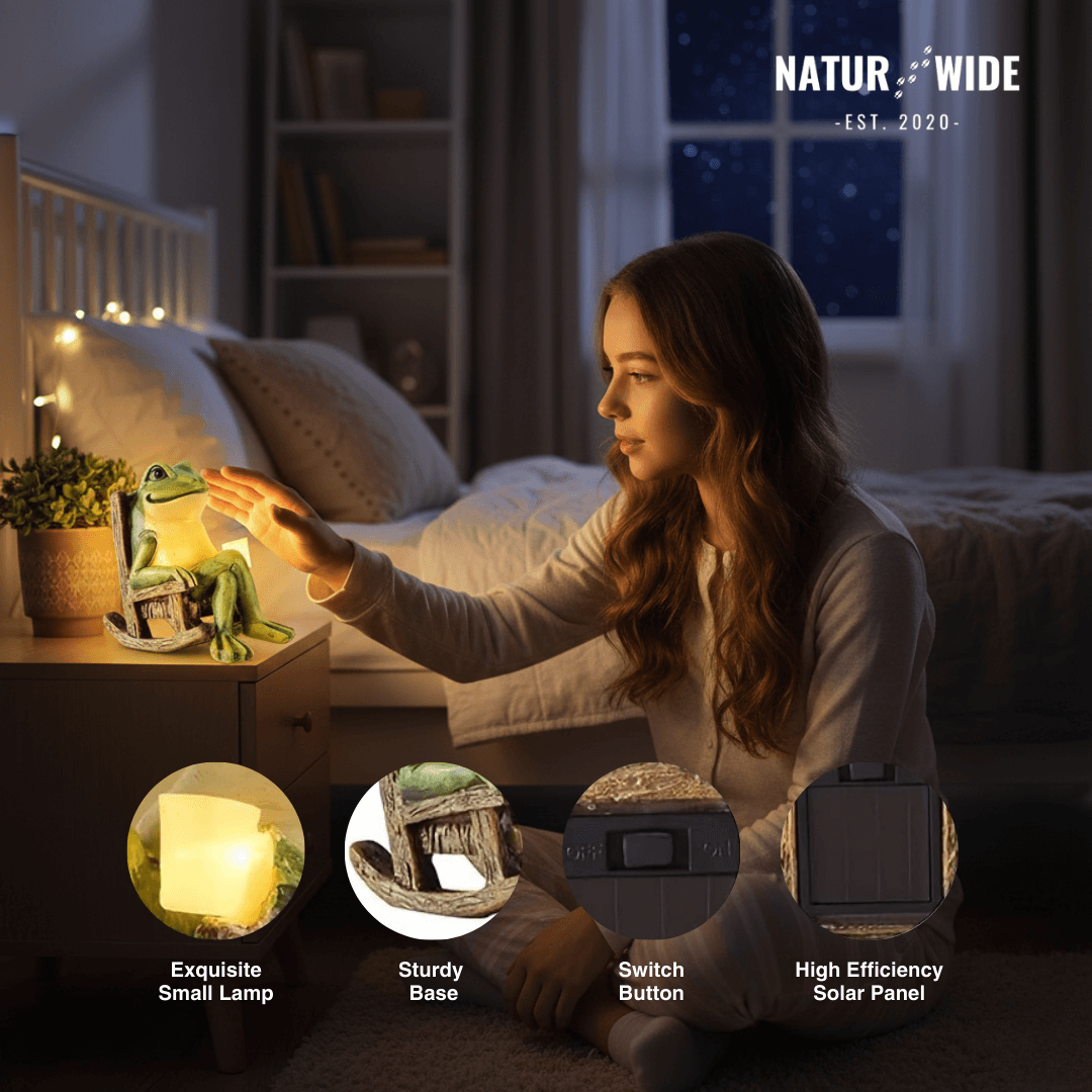 Bring a smile to your garden with the Solar Mini Frog Garden Statue . This charming decoration is not only a visual highlight during the day but reveals its true magic as soon as the sun goes down. Thanks to integrated solar technology , the little frog stores solar energy during the day and emits a soft , warm light at night, creating a cozy mood.